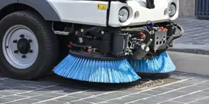 A typical street sweeping crew includes rubber-tired front-end loaders working alongside trackless sweepers, mechanical street sweepers, and dump trucks to efficiently clear debris from roadways.